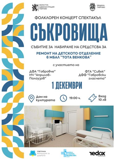 Благотворително събитие за събиране на средства за ремонт на детско отделение в МБАЛ "Тота Венкова" - Габрово. Участват: ДФА "Габровче", НЧ "Априлов-Палаузов", ФТА "Сивек", ДФФ "Габровски гласчета".
